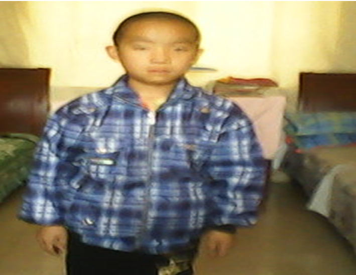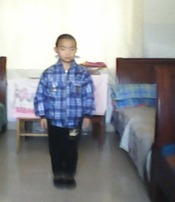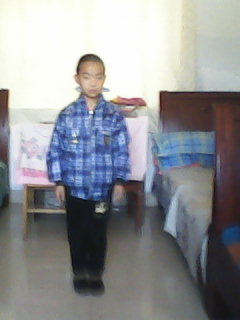 我的弟弟有一双大大的眼睛,能说会道的嘴巴,乌黑发亮的头发。他穿着蓝色带有格子的上衣,一条黑色的裤子,一双布鞋。