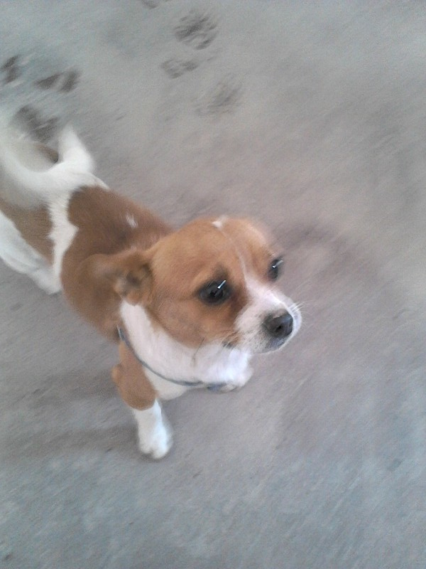 我家有一只聪明的小狗,我给他取名叫黄黄,因为它穿着一件黄白色的衣服。