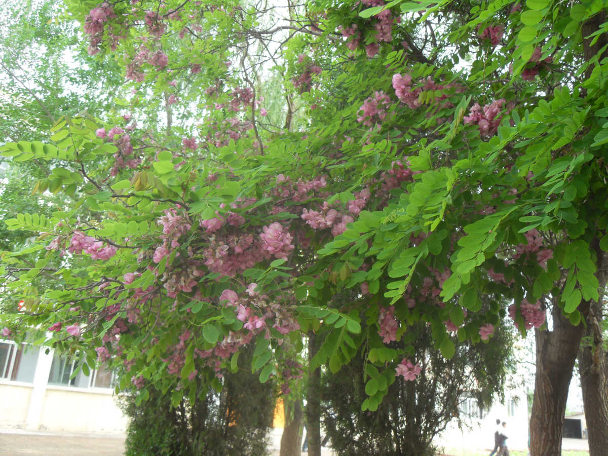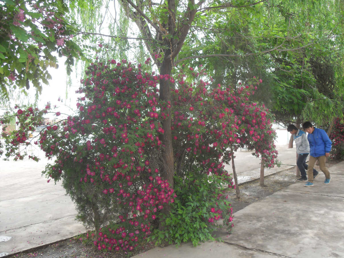 在槐树下面,还有几簇玫瑰,一眼望去,让人看到非常心旷神怡,紫红色的花瓣和深绿色的茎叶,点缀了整个校园,花朵在枝干上摇摆着,充满活力,朝气蓬勃,花的香味也吸引着不少人在花丛旁边玩耍。