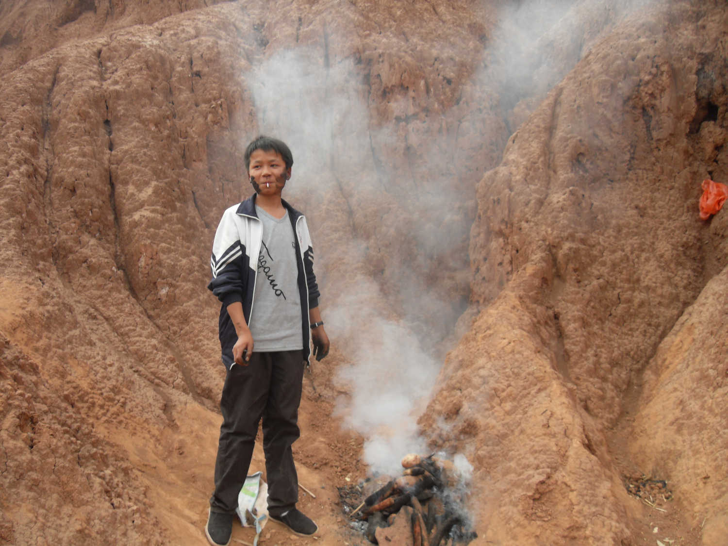 首先要挖个小窝,在它的周围用土块垒起来,垒成一个封闭的空间,就像塔一样,然后在那个小窝里烧柴火,一直烧到上面的土块红红的,就把土豆倒进小窝里,把那些烧红的土块打下去,不一会儿,土豆就会被覆盖在上面的土块烧熟了。因为都是农村的孩子,大家干起来很得心应手,但是我们烧出来的土豆因为火太大,烤的黑黑的。大家一起的劳动成果,虽然样子有点丑,但是吃着很香,黑色的灰抹得满脸都是,大家玩得很开心。