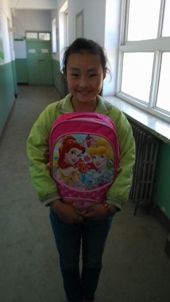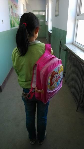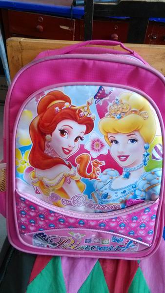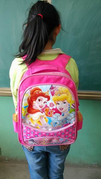 这个书包外表大大方方,颜色也很鲜艳,是由红色、粉色组成的,前面有两位漂亮的卡通主公,她们总是微笑地看着我,仿佛在说:"小主人,你一定要好好学习,我会帮你管理你的书本的。"书包的背面是两条宽宽的双肩带,上面有一层又厚又软的海绵,背上它你不会觉得费劲,反而会觉得既轻松又舒适!
