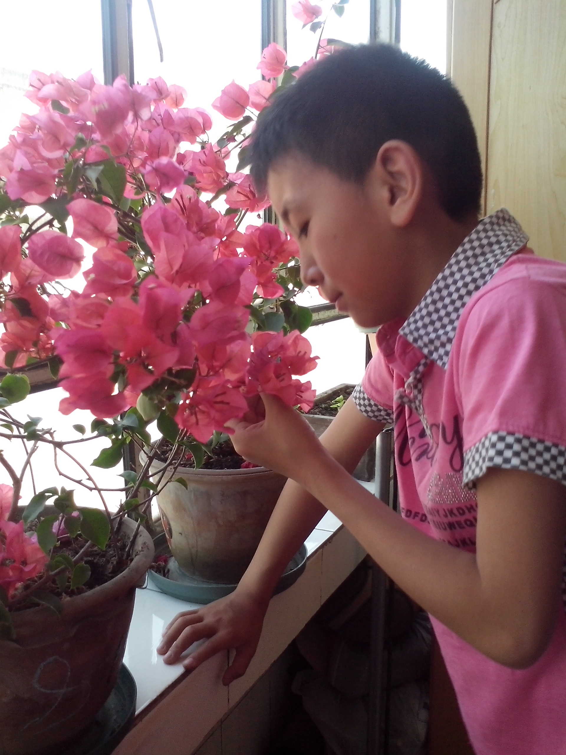 最近邻居家张奶奶又给我们家送了一盆三角梅,在我们全家的精心照料下,三角梅长的十分旺盛,远远望去它就像一个大大的花球。有时候我写作业累了或是烦了,我就走到花盆边上仔细的观赏三角梅,看着粉色的花朵,好像它们在对我微笑,于是我就不觉得累了,烦了。