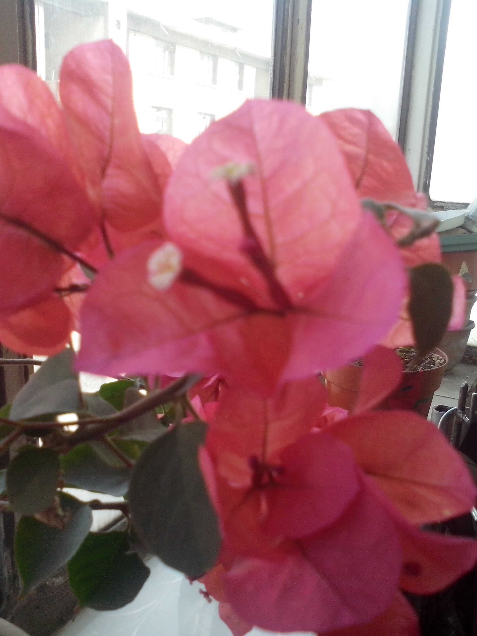 三角梅这种花大多在春天和夏天开的比较旺盛,三角梅喜欢热,它的主杆不算粗大,在主杆顶端分出许多枝杈,翠绿的叶子和漂亮的花朵就交错的长在其中。花瓣中还有三个花蕊,可漂亮了。