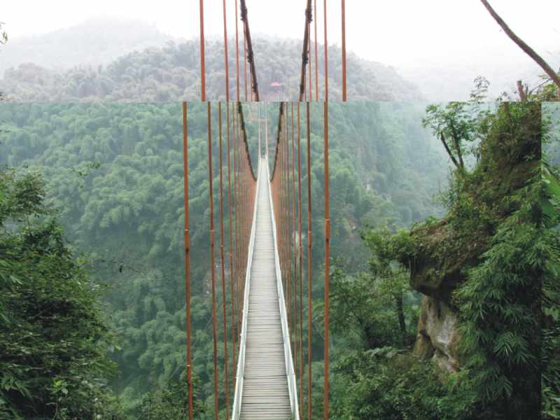在谷深处的两山顶峰间,横跨着一条百米多长的钢架吊桥气势非常雄伟,站在桥上向谷底望去近有百米之高,有恐高症的真可谓“心惊胆怯”。我不得不佩服人工巧匠的巧夺天工。