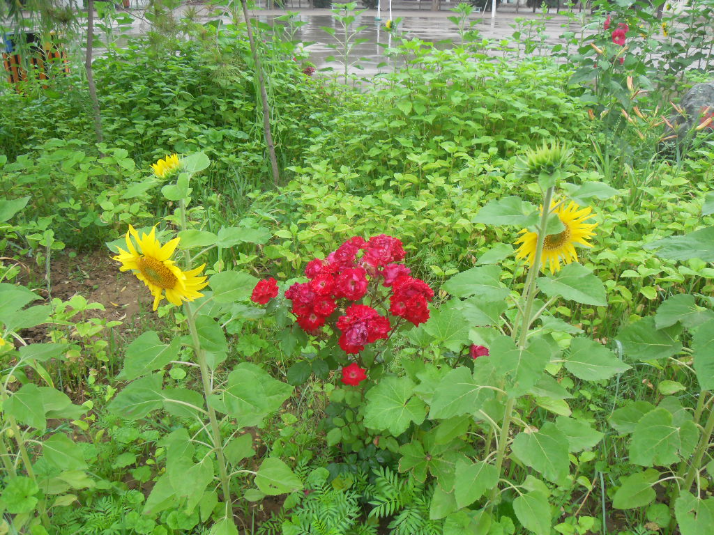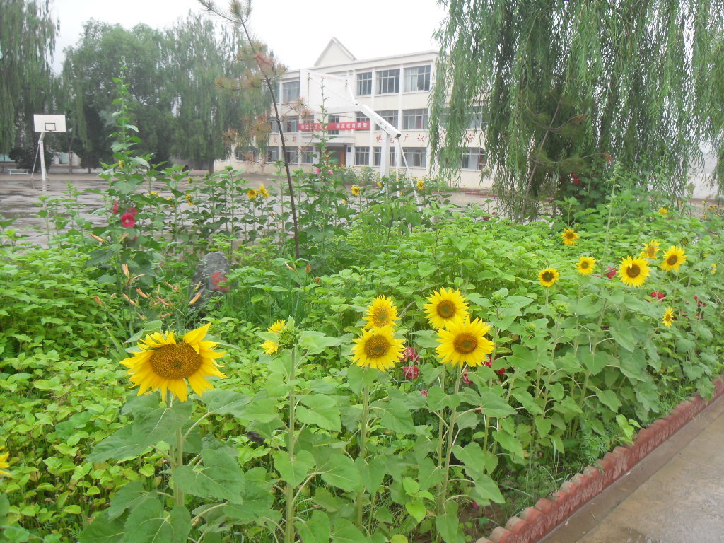 在学校的花园中,在雨水的滋润下向日葵也开始茁壮的生长,几经开始结果实了,给校园增加了许多生机。在雨水的冲刷下,整个校园都散发着泥土的气息,让人觉得神清气爽。这就是我们雨后的校园。