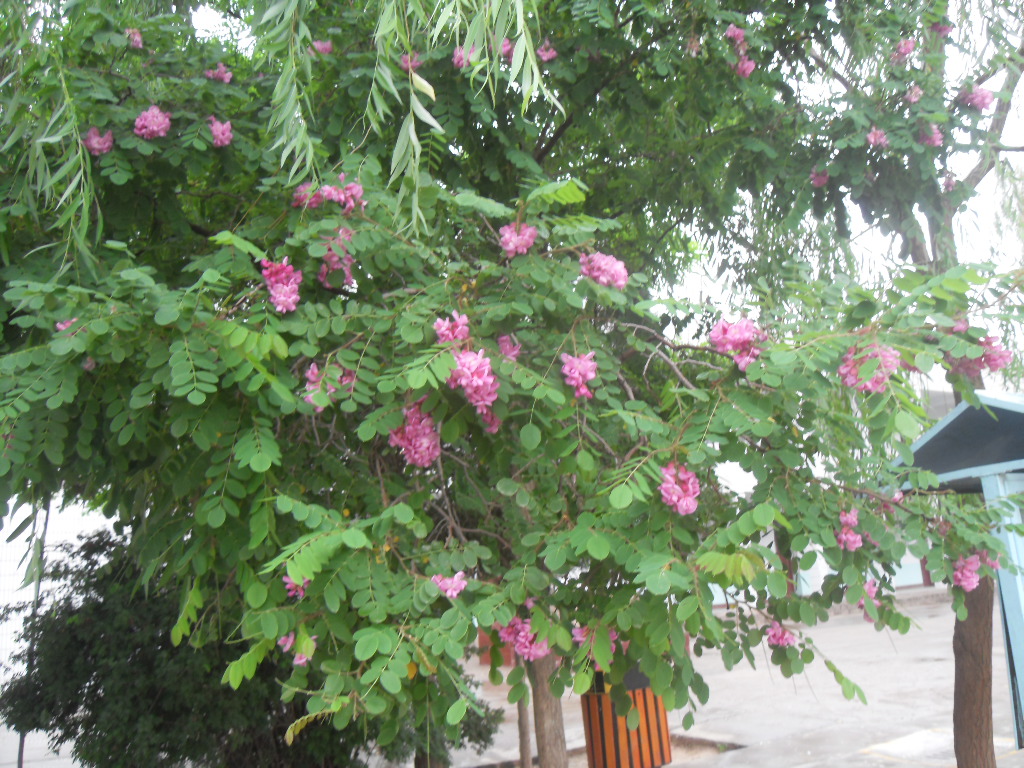 那树枝上的槐花,在雨中散发着诱人的清香,白色的花瓣上,闪着晶莹的亮光,那是小水珠反射太阳光得来的。红槐花树上点缀着一串串红色的槐花,还带着一点紫色,漂亮极了。树下是一层被风雨打落的花瓣,他们已经蔫了,失去了往日的风采,但依旧绽放着最后的美丽。
