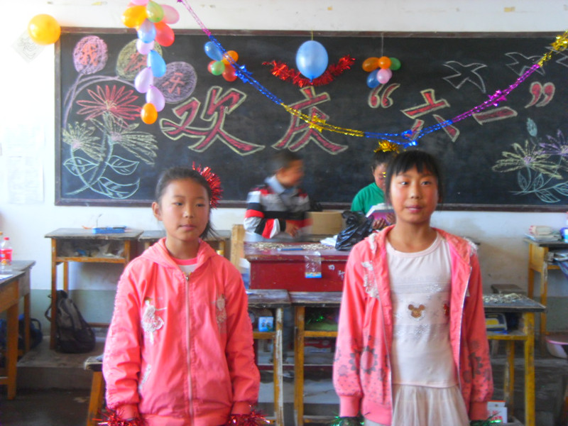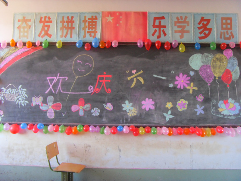 今天早晨,我早早来到学校,一进教室,黑板上那四个方方正正的大字"欢庆六一",跳入我的眼帘。再看看,同学们有的吹气球,有的拿线把气球串成一串,挂在教室的灯管上,和黑板的两侧。还有一些剩下的大气球被放到了玻璃夹层里面,教室里充满了欢笑声。