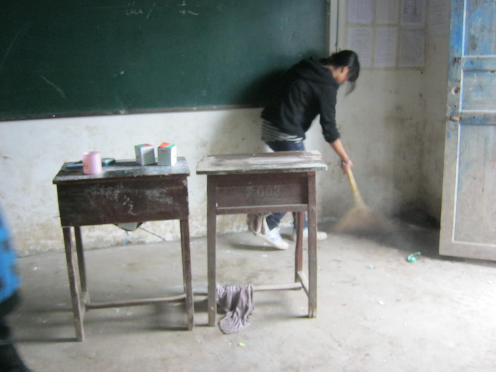 从外面看来,这栋教学楼很美观,我想里面也是吧。开始我们先进行了教室大扫除,用水进行清洗,虽然冷水很冷,但能搬进新教室我们也心甘情愿,并用布擦净教室。