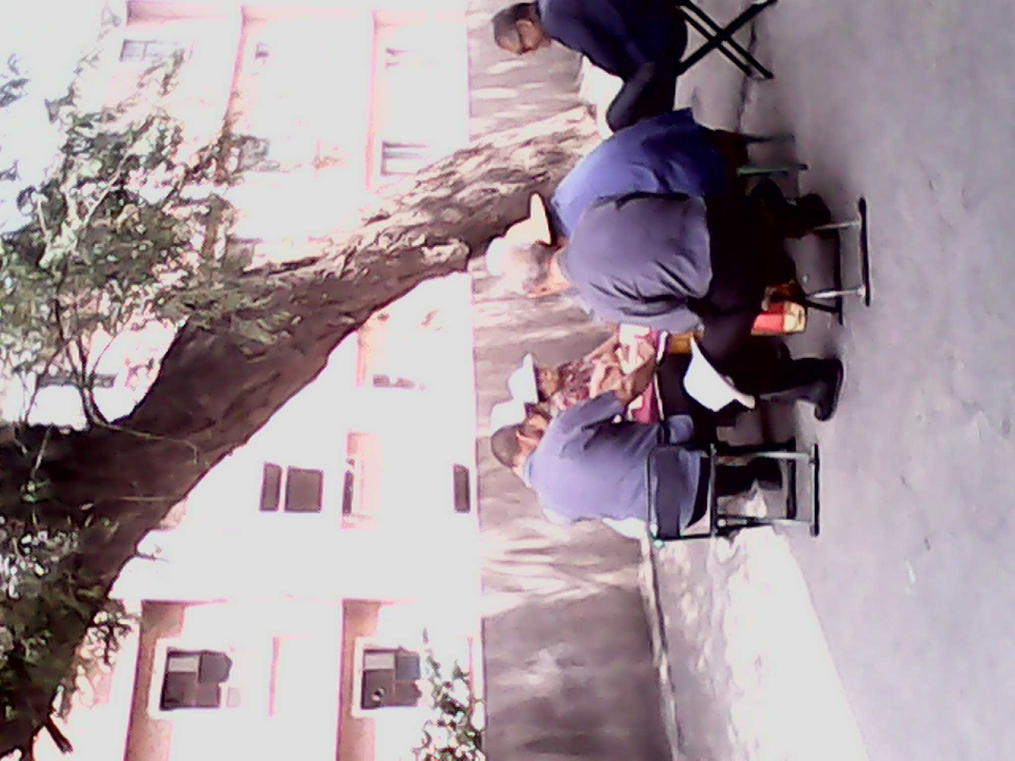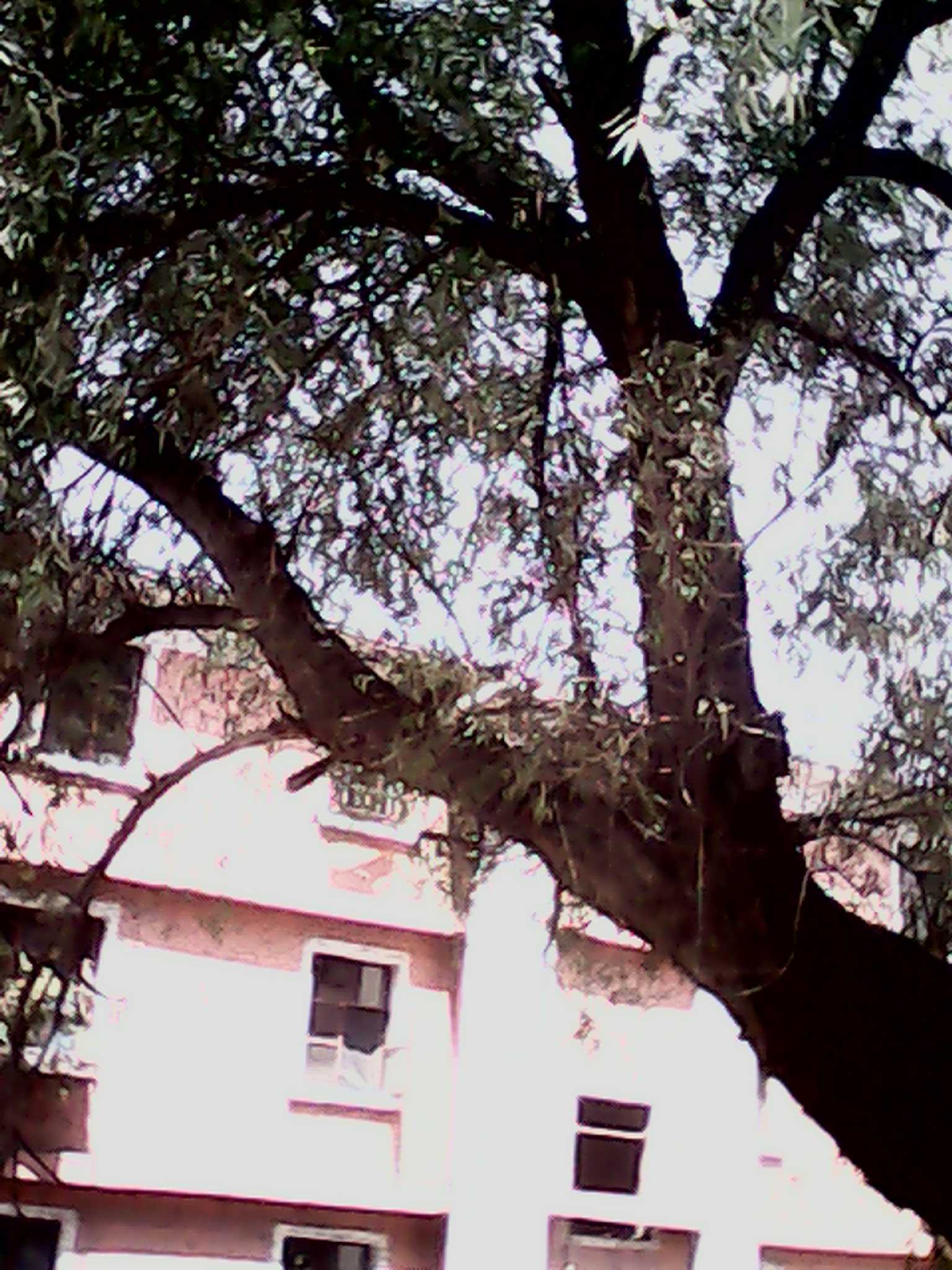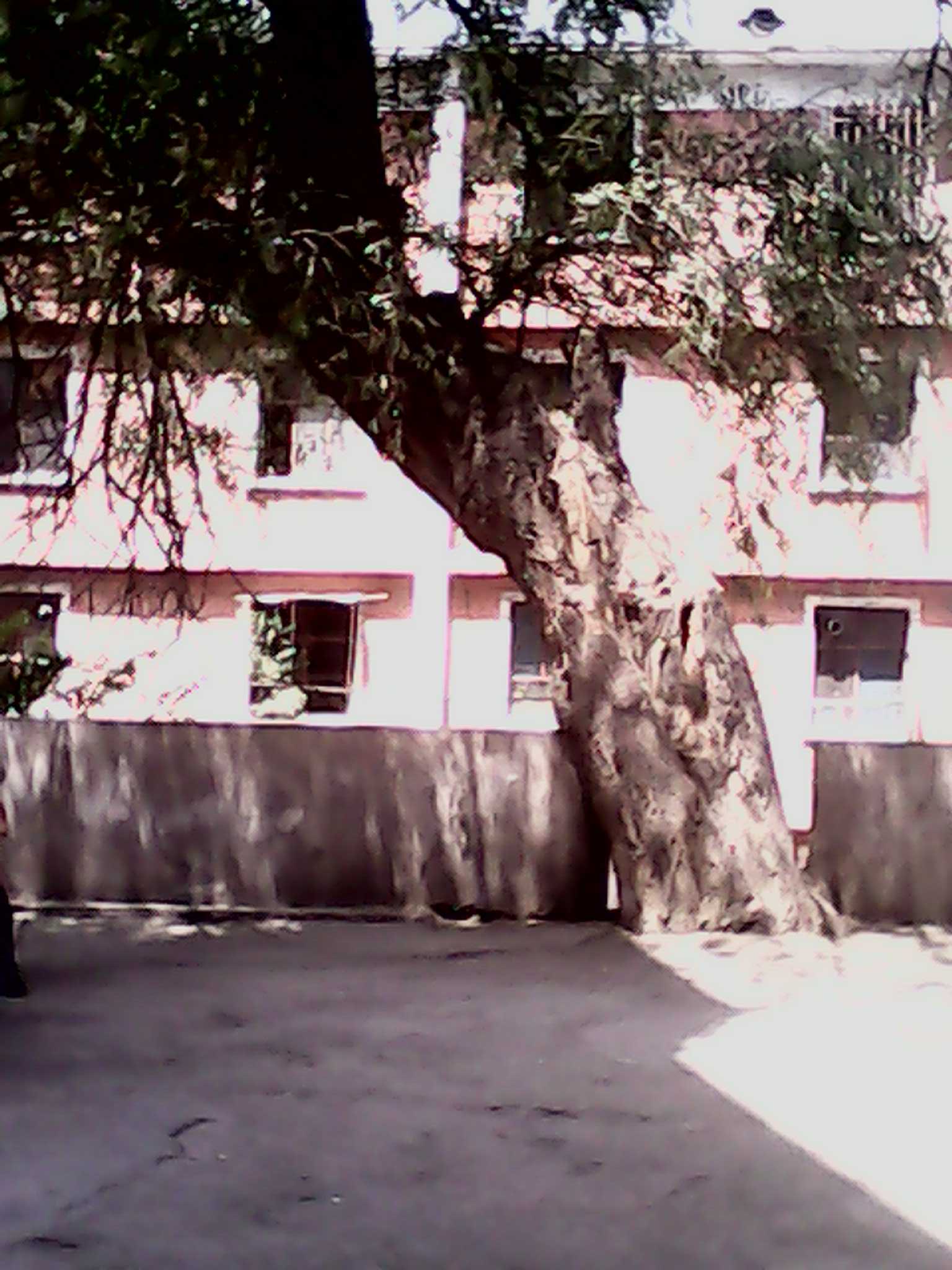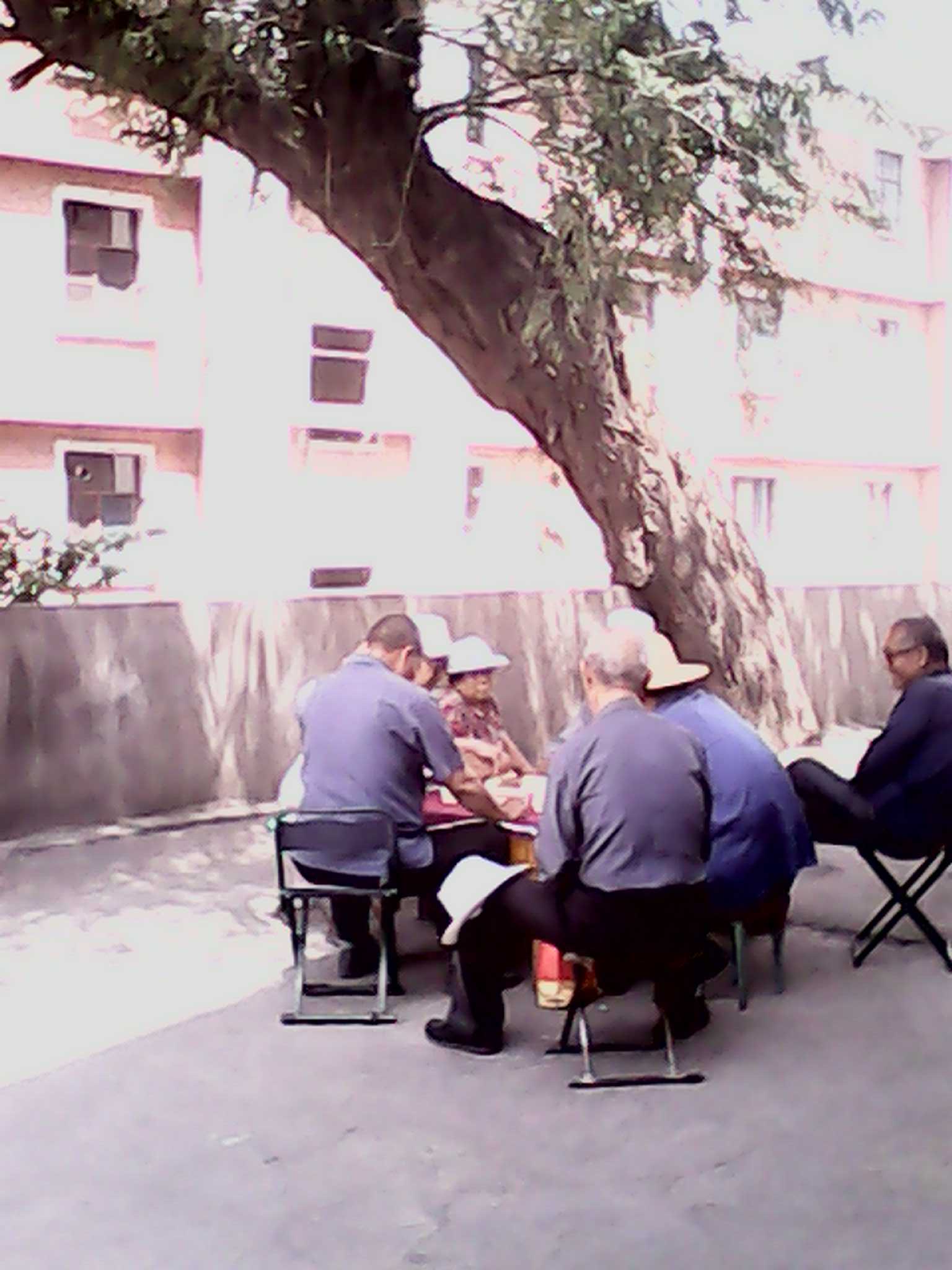 月光下这棵古愧的叶子是那样葱茏,树干式那样粗壮,远远望去真像一位手执利剑的勇士,又像一个顶天立地的巨人,直升苍穹的树干笔直粗大,一阵风吹过之后树叶"哗哗"作响。看有一些老爷爷在这棵高大的树下打麻将呢!