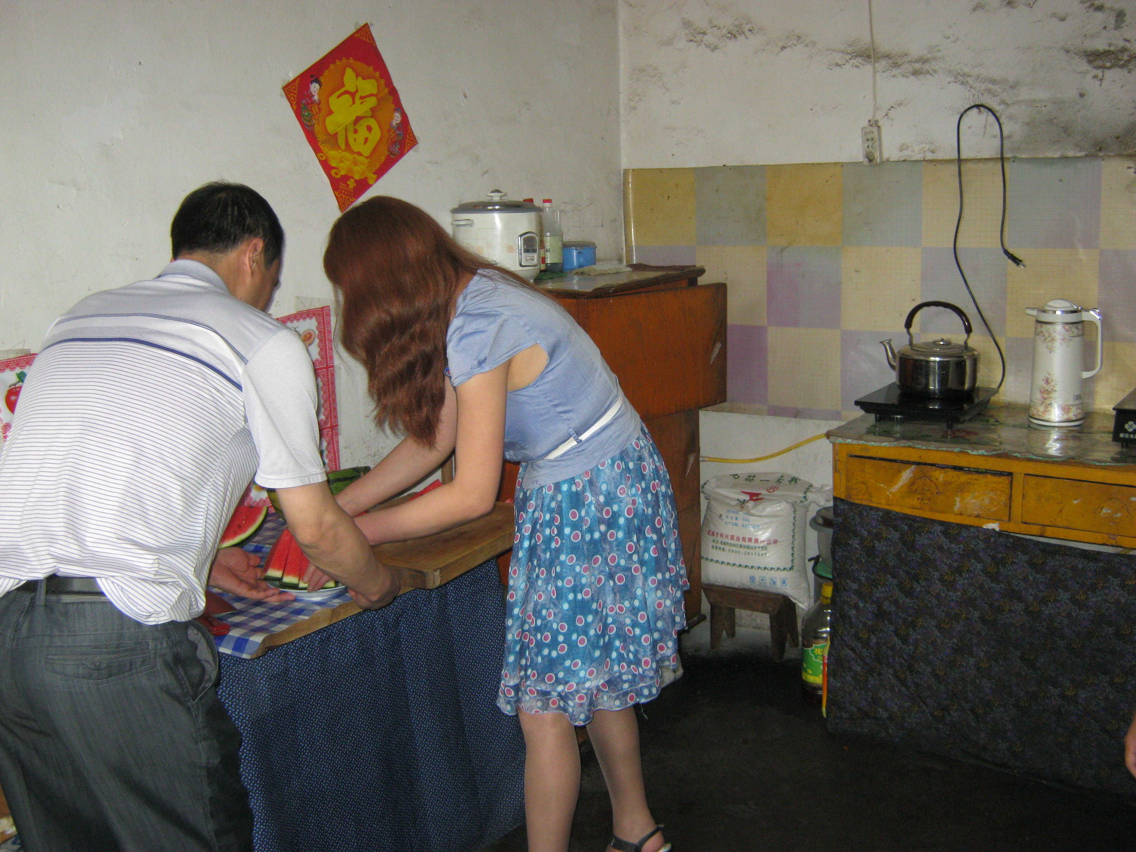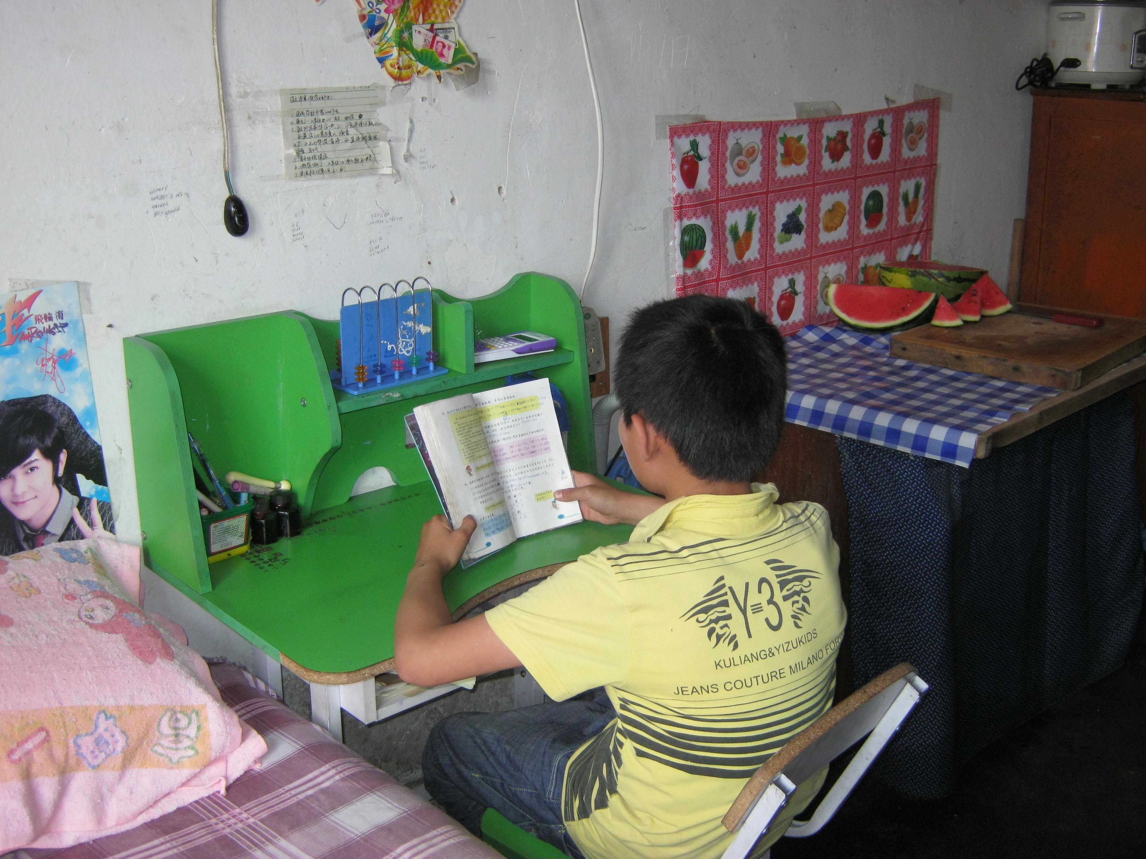 正在我环视房间的时候,李志洋的爸爸已经端了一大盘切好的西瓜从屋外走了进来,放在了茶几上,笑呵呵地招呼我们吃西瓜。对呀,应该还有个厨房和李志洋的房间啊。主人告诉我,隔壁同样大的一间房就是他们的厨房,也是李志洋的卧室兼书房。我索性在李志洋爸爸的带领下参观了一下他们的厨房。床、衣柜、书桌、切菜擀面的大案板、煤气灶绕着墙脚依次摆开,空间已经所剩无几了。这就是李志洋每天休息,学习的地方。