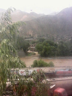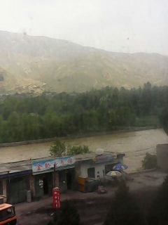 向前看去浑黄的大通河水缓缓地向下流去,岸边生长着一片小树林在水泥场尘埃的笼罩下显得十分神秘。