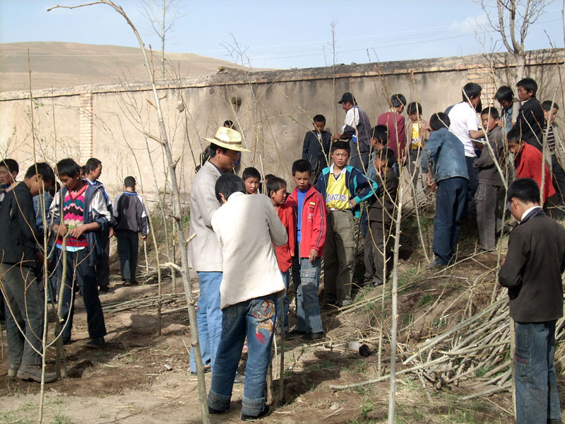 老师们在教学生们怎样挑选出好的树苗来,看,校长和老师们正在带领我们植树呢……