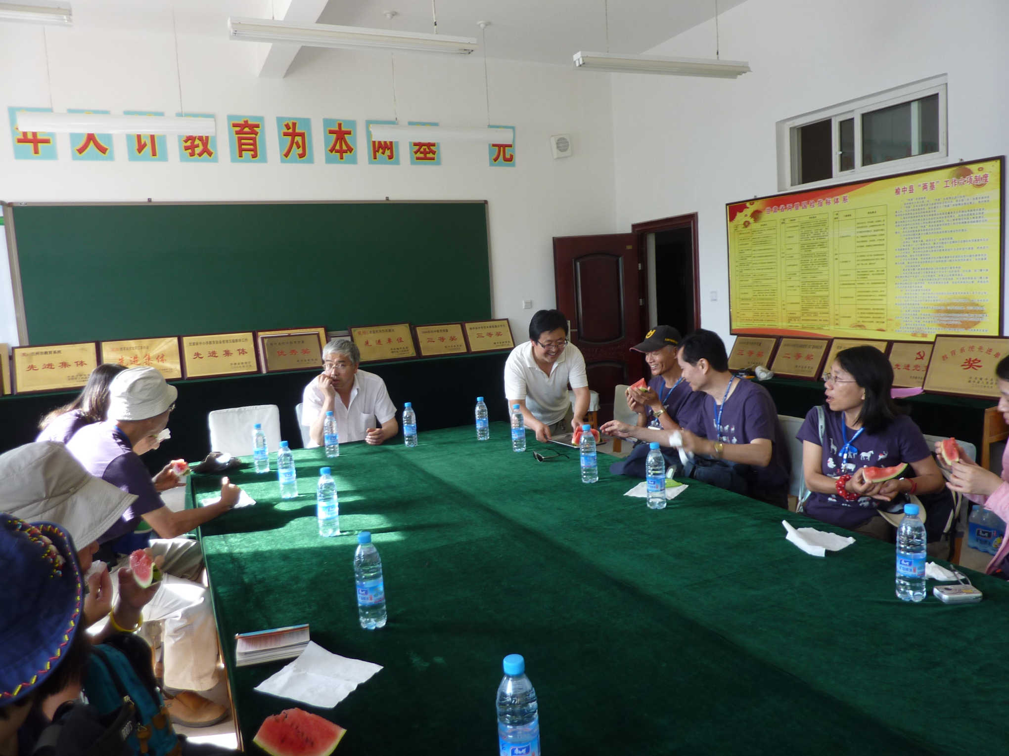 下午四时多,在爱心人士连继走访银山中学、清水中学之后,不顾炎热与疲惫,一进我校就开始了解学校情况。由于时间紧迫,爱心人士没有参观学校新建的宿舍,直接步入教学楼会议室,座谈了解学校和学生情况。我校校长闫世玉,副校长牛安泰、高国祥,分别向爱心人士介绍了学校的相关情况,西部故事管理员杨小虎向他们详细地介绍了西部故事项目的具体操作及情况,并将去年爱心人士捐助2000元的回执原件送给负责人,同时也对他们的关注表示感谢。