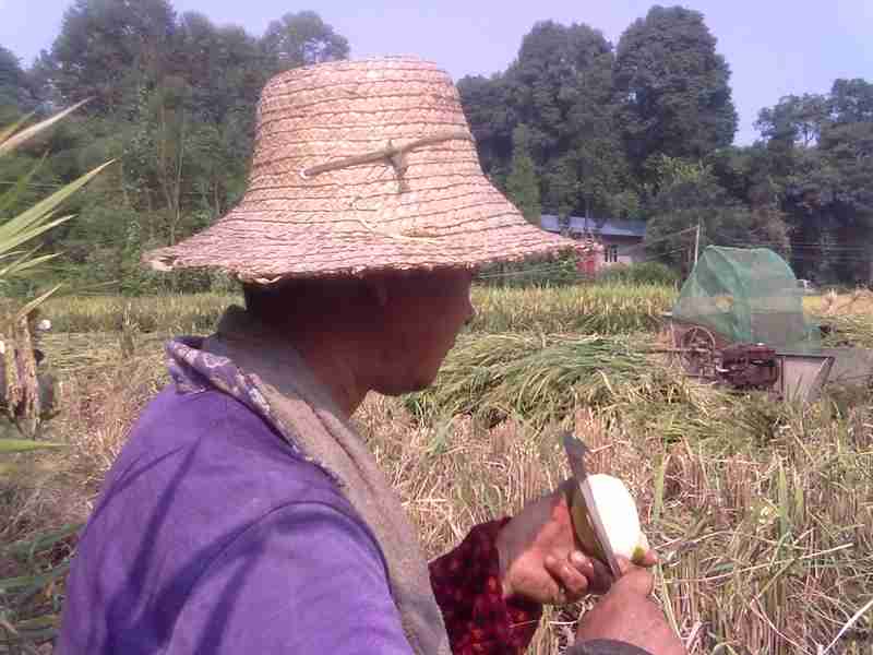 我们数人静静地坐在稻田边较处,捧着梨儿,望着打谷机后成堆的稻杆和前面零散成抱的稻谷,各有所思,享受这短暂的休息。