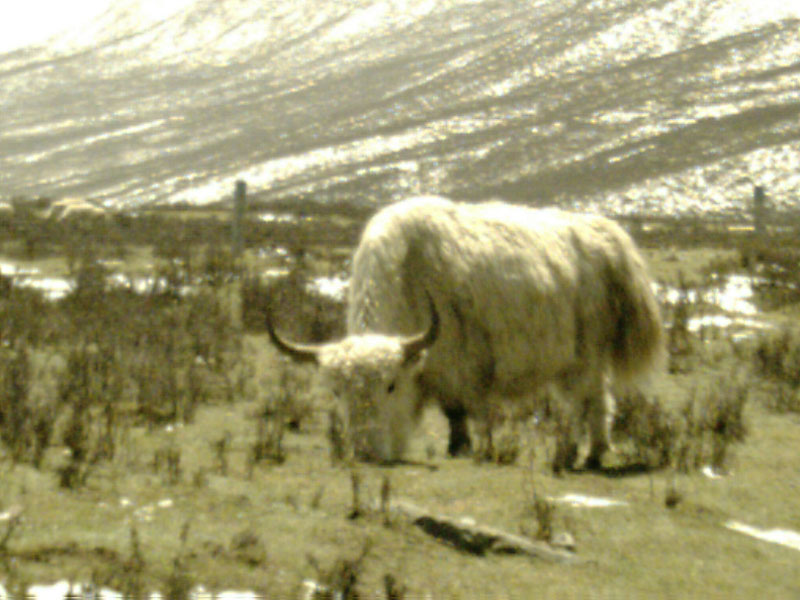 这只强壮的白牦牛是牛群中的首领,也就是头牛。它雪白的毛发和乌黑的眼睛展示着它独有的风采。这个季节它通常都是一个人漫步在草原上,游闲的啃着青草。