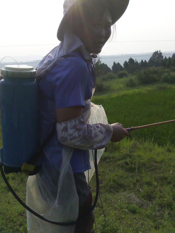 在“打药”之前换上一套旧衣服或脏衣服,如果你穿着一套干净衣服就去干活完事之后估计也没一处干净的地方了,或者是满身的农药味。背上背着农药,左手把着一个类似摇柄的东西上下摇着,右手抓住一根细长的管子慢慢的向前推进着。