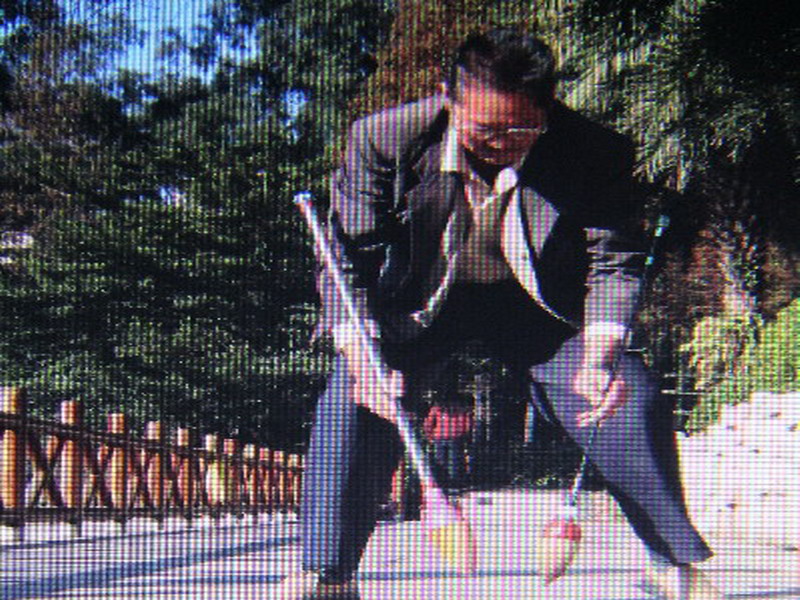 星期六早晨,我正兴致勃勃地玩着健身器,不经意间一回头,发现一位身着蓝色外套,戴着石头镜的老爷爷提着一个小水桶,手拿一支“特大号”的毛笔,走向花园里的水泥地。