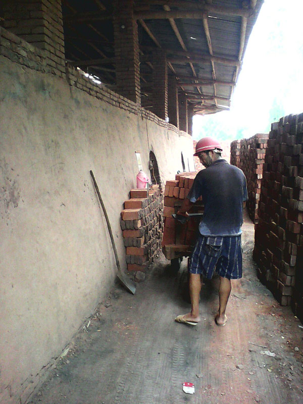 我去叫幺爸吃饭的时候,看见一群皮肤黝黑的中年人在烈日下拖着一辆辆装满砖胚的板车,在空旷的地坪上飞奔。他们,就是砖瓦厂里那些辛苦的农民工。今天,我亲眼目睹了他们辛苦劳动的场面。幺爸虽然干的是技术活,平时比其他人要清闲一些。但是一到砖机出故障,他忙得连饭也顾不上吃。我叫他把饭吃了再来做,他说他要尽快把机器修好,免得误了别人的工期,从这一点我看到了他对工作的负责。在这个砖厂工作的大多数都是接近五十岁的老人和一些三四十岁左右的女人,他们都是因为家里有老人和孩子不能到外地去打工,所以才到这么辛苦的砖厂赚一些零用钱供家里开支。