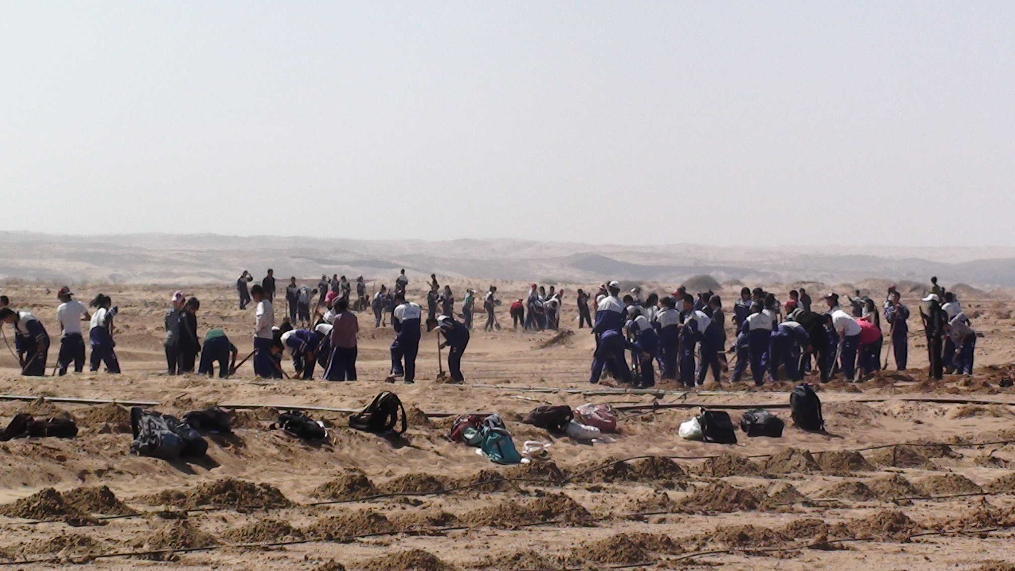第二天,同学们准备好干粮,带好铁锹踏上去红崖子植树的路。经过两个小时漫长的路程我们终于到了目的地。刚一下车同学们的热情就一扫而光,看着一眼看不到边的沙漠没有一棵树,“这里种树能活吗?”“这么多荒地啊”“我们的干几天才可以把这里都中上树啊?”“这里没有水,种树不是白种吗?”“谁来管理这些树呢?”同学们七嘴八舌的议论。