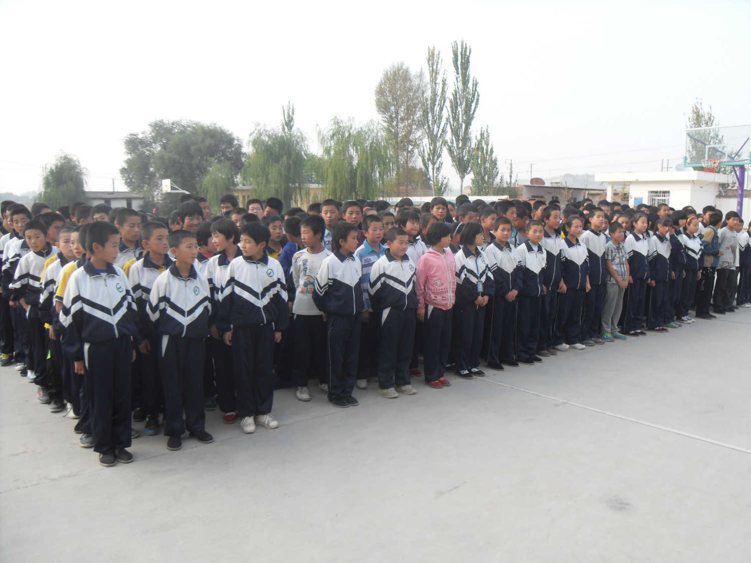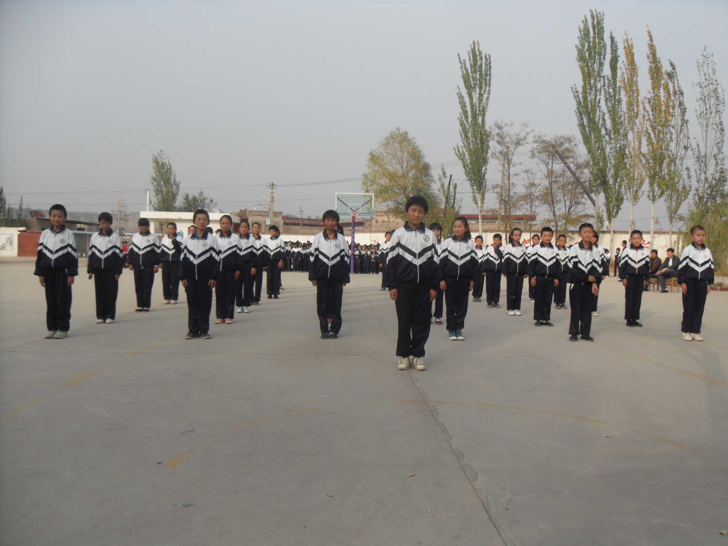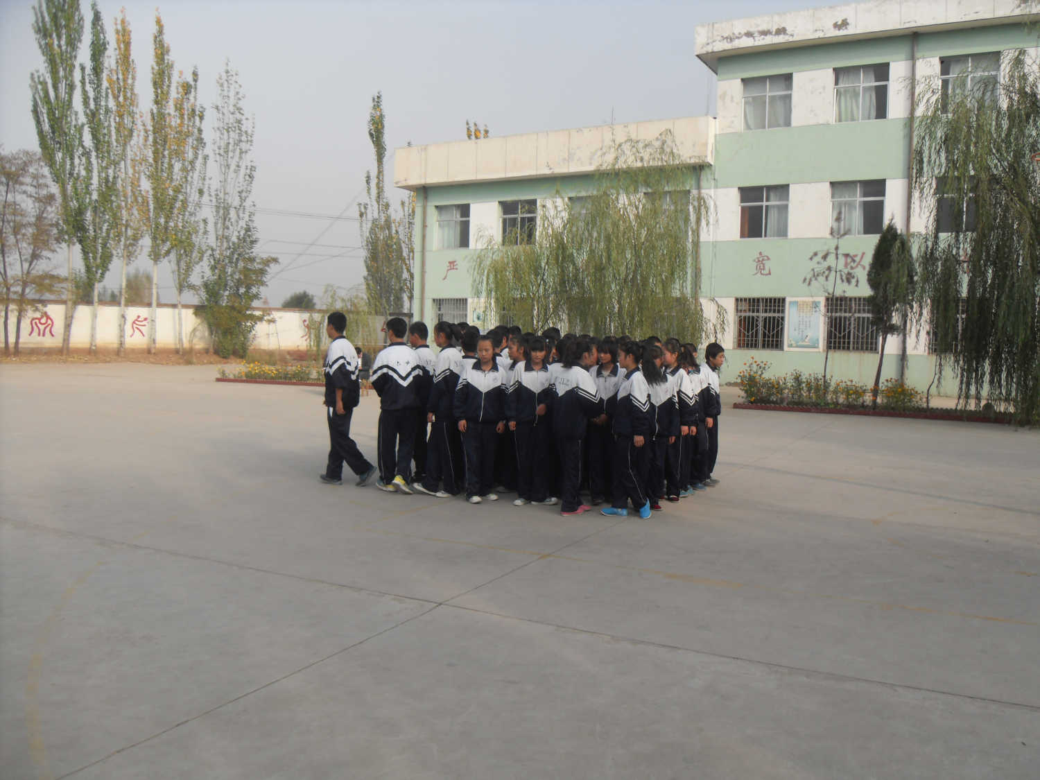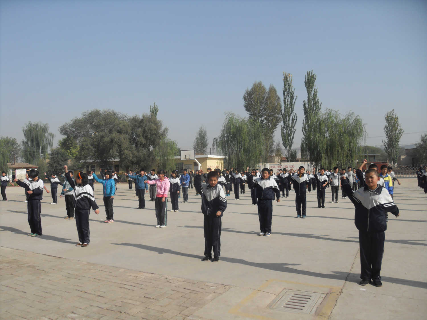 在这样灰暗的天空下,同学们迅速站好队,然后随着老师的指令开始跑操,喊着有力的口号,尽管每个人的脸和手都冻的通红、通红的,但每天早上大家都会按时上早操,没有人迟到。