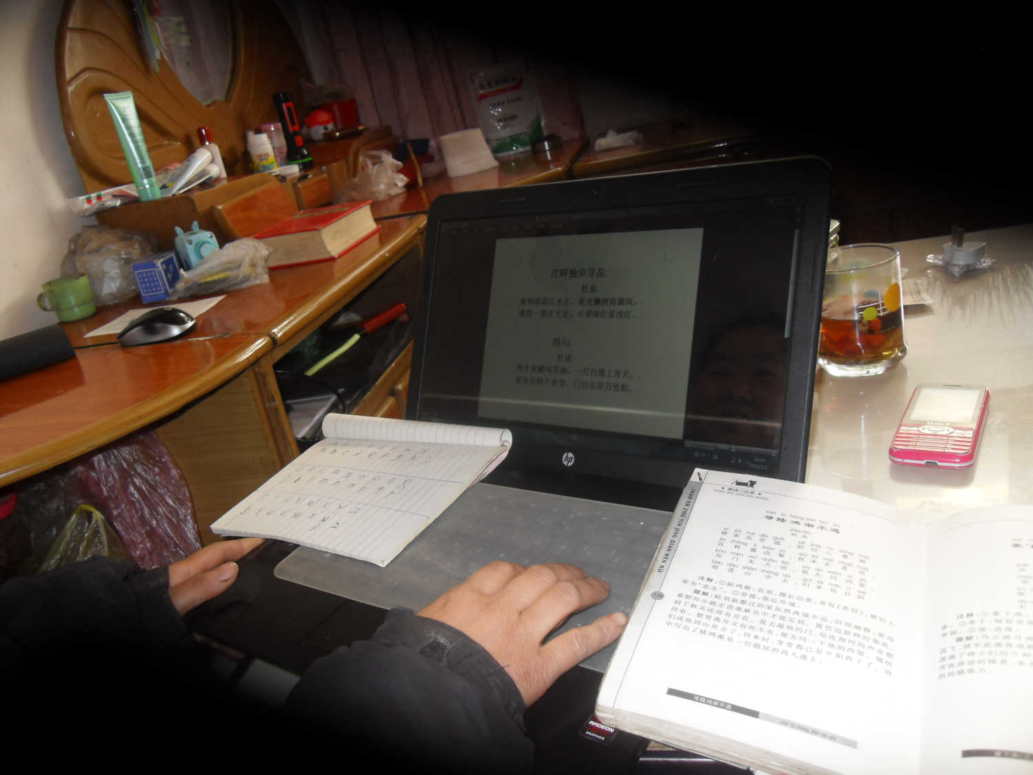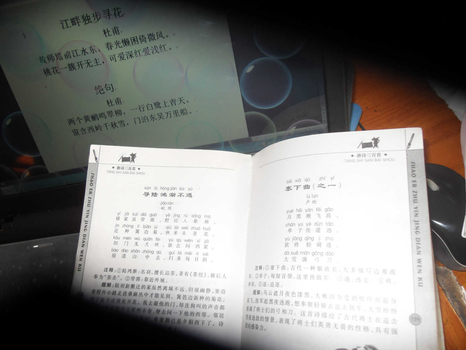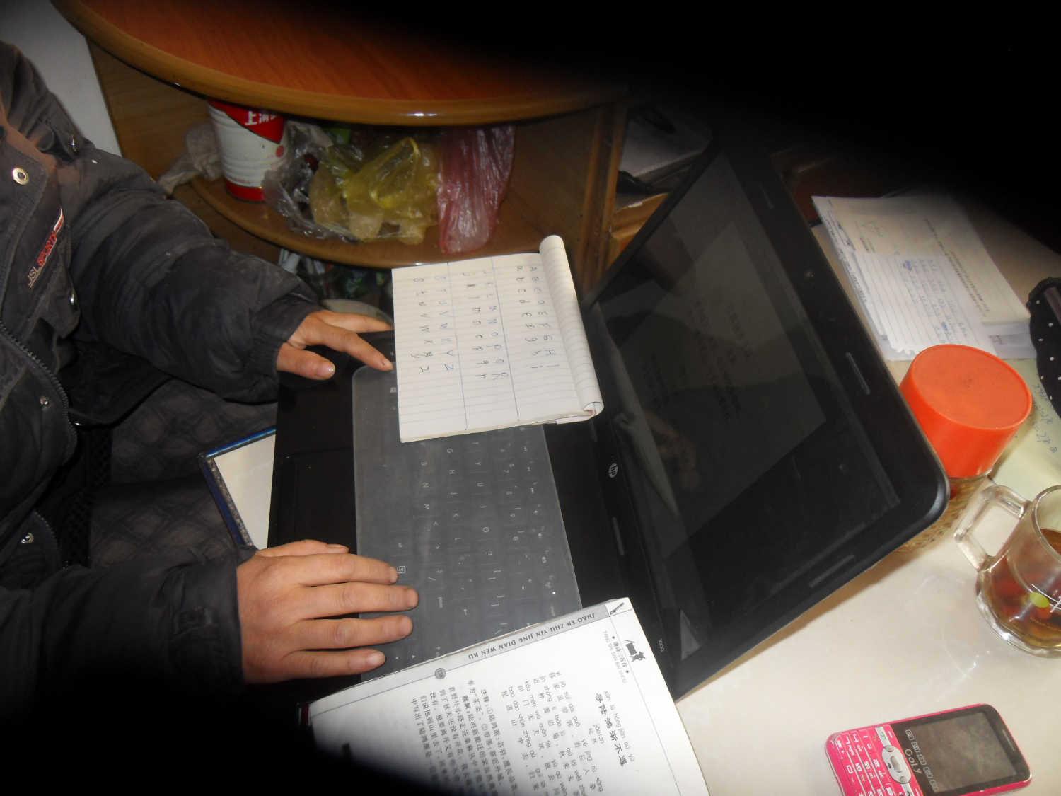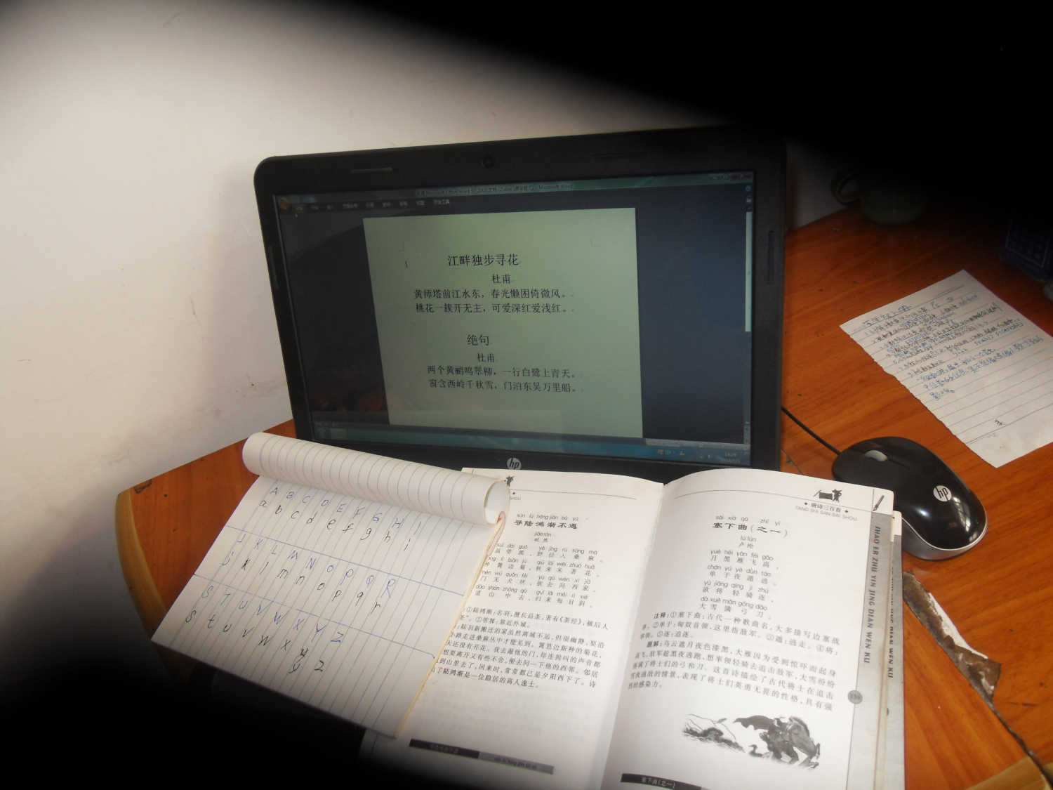 教学正式开始了,我先问爸爸英文字母,爸爸便开始卖弄了:A,B,C,D……听起来怪怪的,就像牙牙学语的小孩子,我想如果爸爸去做一个"小丑"一定会令观众捧腹大笑的。 爸爸弄不清字母,我就给爸爸制作了一张表格,在表格上写好了大小写字母,然后又给爸爸找了一本有拼音的唐诗三百首,爸爸见了它,如获至宝,一手拿着书,一手在电脑键盘上摸索。看一眼诗句,在键盘上敲一下,爸爸时而欢笑,时而表情凝固,时而眉开眼笑,过了差不多10分钟,我检查了一下爸爸的进度,在10分钟内爸爸只打了两句诗,可是让我感到欣慰的是,在这两句诗中没有一个错别字,而且标点符号运用也很恰当。