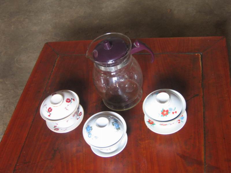 泡八宝“盖碗茶”需要的茶具主要是茶壶、盖碗子。盖碗子,它就像一家人中的掌柜一样,起泡茶作用。而茶壶就像我们平时吃饭时盛饭的碗一样,起装水作用,它有超强的保温作用。