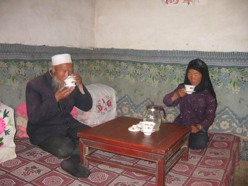 茶泡好以后,专供年过六旬的长胡子来“品茶”。品茶这一环节是八宝“盖碗茶”中最有趣的。两位老人盘盘腿坐在炕上,边剐碗盖,便喝茶,看起来是多么地井然有序。他们不慌不忙,慢慢地品味,完全沉浸在了茶的香味之中。盖碗茶也是穆斯林招待客人的主要方式,家中来了尊贵的客人,当地穆斯林会奉上香气扑鼻的盖碗茶。