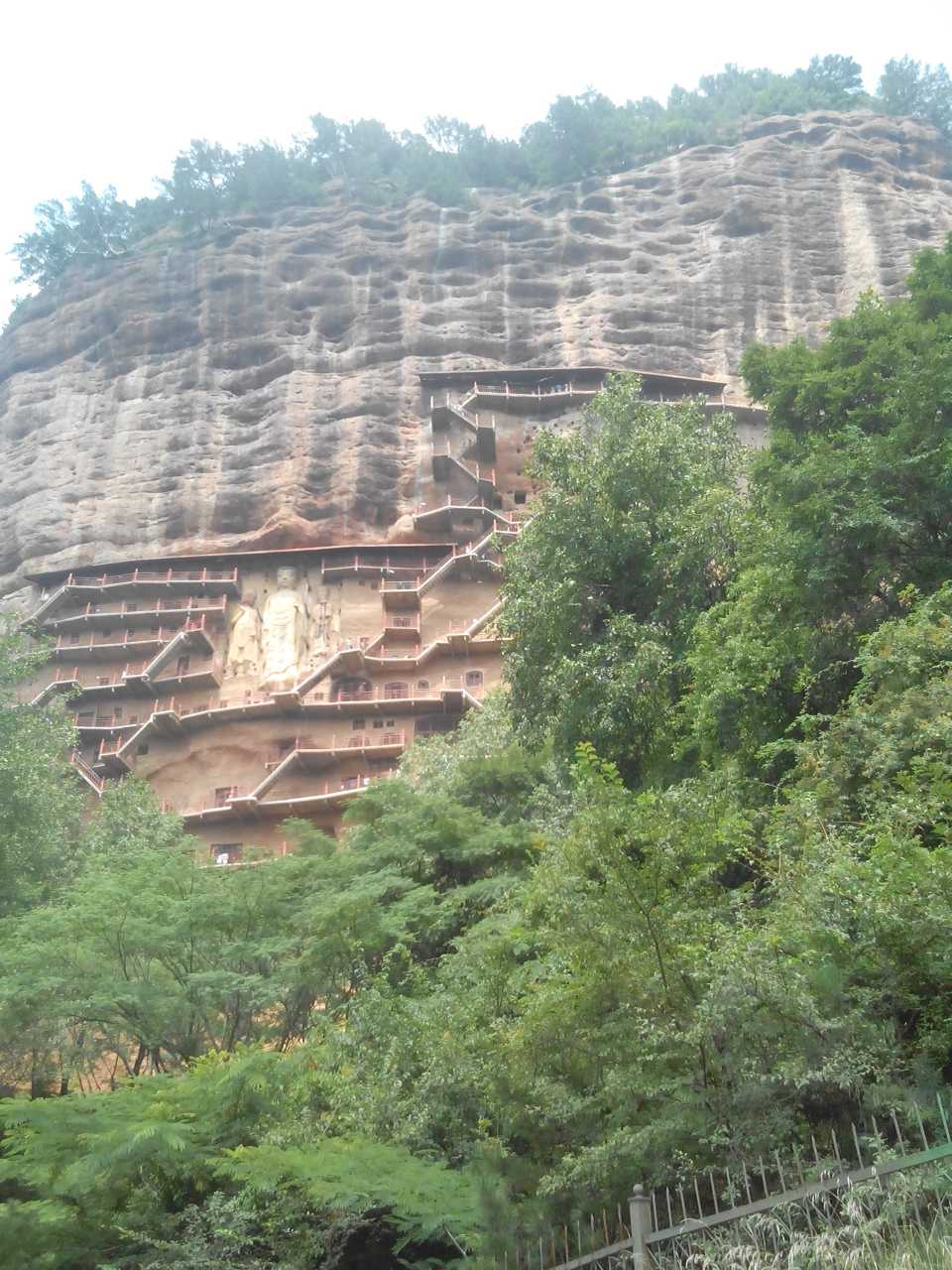 车在回环曲折的山路上走了将近三小时,就到了麦积山。从远处看,就像是一座麦垛,故得名麦积山。买好门票后,我们顺着一级一级的楼梯上去,楼梯的右面是山壁,墙壁上开凿了很多大小不一的石窟,里面都是古人雕刻的塑像;再向左望去,一片绿油油的森林,远处的山在雾的笼罩下,显得更加神秘。再往上走,就是最高的地方了,墙壁的正中间是一尊大佛,脚踩祥云。大佛的旁边是一尊菩萨,那菩萨竟穿的露脐装!可见当时的人们有多时尚了。再往上看,头顶是几幅壁画,其中一幅是一人骑着马,但是你若站在右边向上看,你会发现那马的头似乎朝着左边,但当你在左边向上看时,那马的头又朝向右边了。也就是说,无论你站在哪边,马的屁股始终朝向你。这足以说明古代人的智慧。