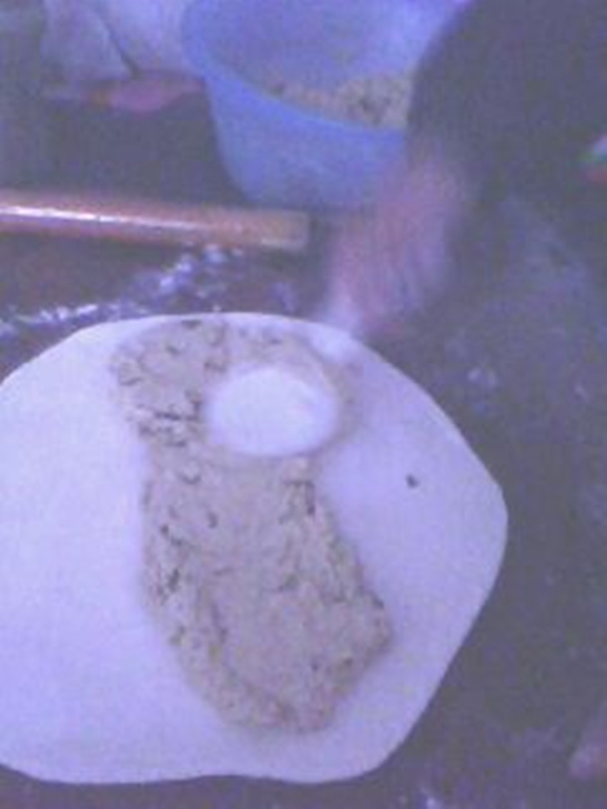 "转包城"是由白面和玉米面混合而成。首先,将发酵好的白面擀成一块稍大的面饼,再把玉米面搅匀,从中加入苦豆粉和晒干的玫瑰花瓣,然后再放些白砂糖。将它们搅匀之后,平摊在擀好的白面饼上,然后一卷,切成均匀大小的小方块,并在上面抹些油,放在锅里就可以了。