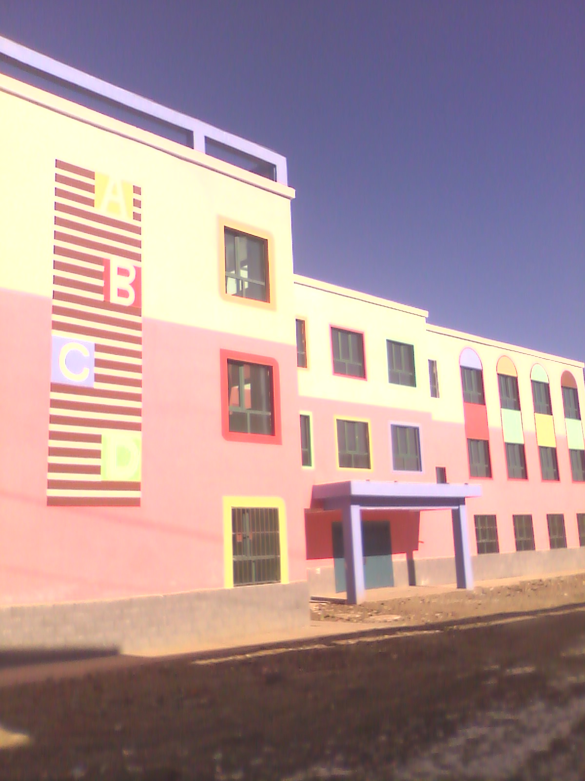 中心幼儿园修建的很气派,幼儿园综合楼外面用红、黄、绿、紫、蓝、灰、粉红七种颜色搭配粉刷,色彩协调鲜艳,正面墙面上镶贴有A、B、C、D四个英文字母,非常耀眼。不要说里边的设施,外面的颜色就能吸引小朋友;不但小朋友喜欢,就连我们小学生也非常喜欢。