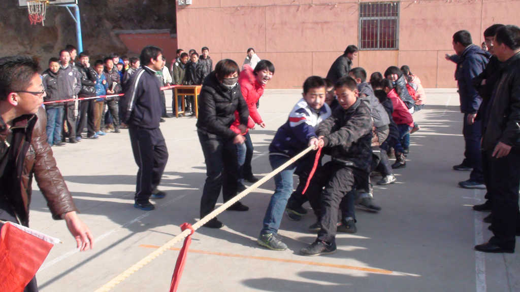 啦啦队的同学掩饰不住自己紧张的心情,对队员大声呐喊起来。突然,我班的运动员猛的一用力,红布子向我班飘了过来老师记得涨红了脸,不住的鼓励运动员。渐渐地,对手坚持不住了,王老师把红旗举向了我班运动员。