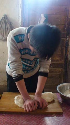 我用盘子把面倒在大盆里,然后把温度不是很高的浓盐水慢慢倒入盆子里,用左手慢慢的和面。但是,盆子里还有很多没有揉好的面粉,于是我又倒入了很多的水,但是面盆中还有许多面渣子,我于是又倒入了一点水,终于面被我揉成一团了。我将它放在小案板上揉,这面真是和得太软了,我便轻轻的揉,但不见效,我生气了,我使劲的揉它,恨不得立刻就揉好它。