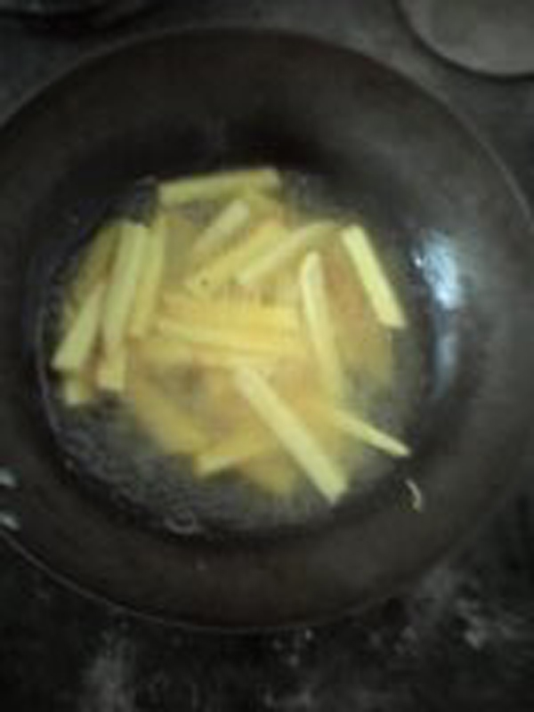 首先,拿几个红薯洗干净,再把他的皮削去,然后用刀把它切成一条条的小长方体.再在锅里倒一些油,等油热了,再把切好的红薯放进去炸,炸成金黄色的时候,将它盛入盘子中.