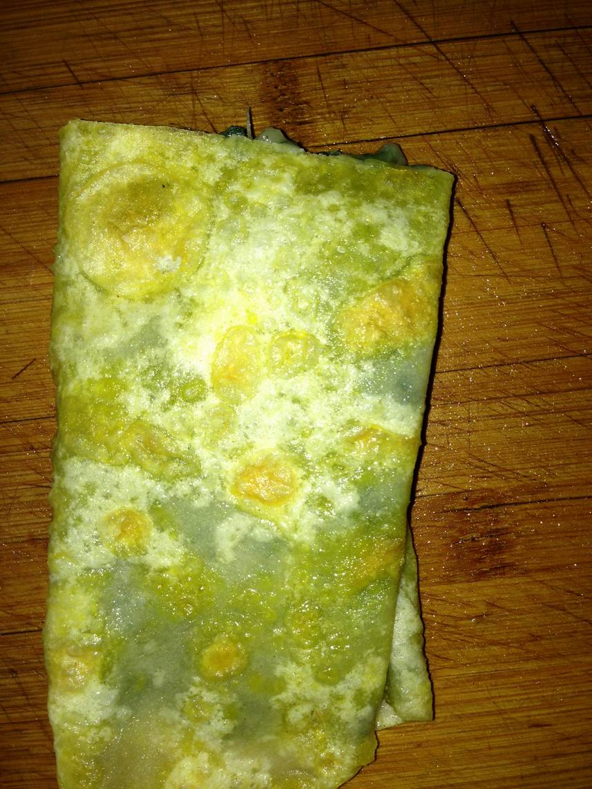 妈妈又和面,在锅里煎出金黄的面饼,在面饼里摸上蒜沫,再把荨麻粥轻轻的舀到面饼上,卷起来,就可以吃了。大家都高兴的喊着:“背口袋喽!”便拿起来开心的大吃起来。因为面饼卷着粥,像盛放粮食的口袋,所以我们把这种美食叫做“背口袋”。