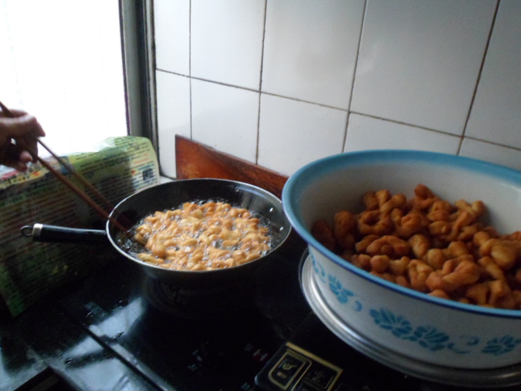 爷爷在锅里倒上适当的油,打上火,将油烧开,负责炸麻花。我也学着奶奶的样子做好了一个麻花,样子没有奶奶做出的饱满好看。奶奶的动作很娴熟,几分钟后一个个麻花便躺在