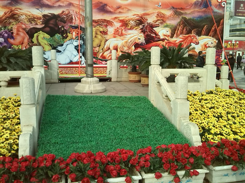由于现在是春节期间,所以广场上也是十分热闹的,并且也十分漂亮。虽然现在是冬天,但广场上有好多地方都插满了花,花也十分繁多美丽。