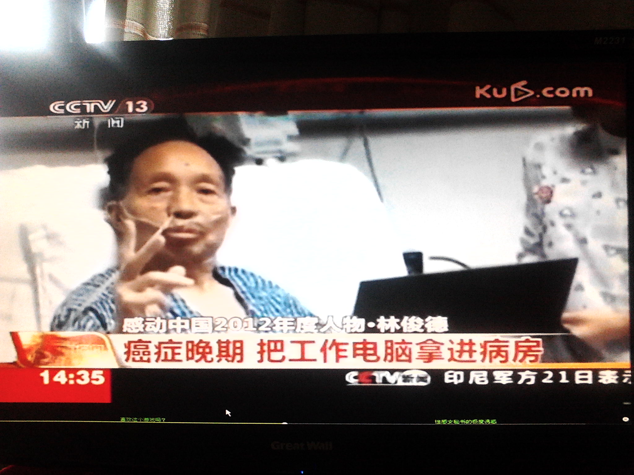 林俊德,中国工程院院士,总装备某基地研究员,他入伍52年,参加了我国全部核实验任务,先后获得20多项成果为国防科技和武装发展倾心心血,在癌症晚期,仍以超常的意志,工作到生命的最后一刻。2012的5月4日,林俊德被确诊为"胆管癌晚期",为了不影响工作,他拒绝手术和化疗。5月26日,因病突然恶化,他被送进重症监护室,醒来后,他强烈要求转回普通病房,他说:"我是搞核实验的,一不怕苦,二不怕死,现在最需要的是时间!"林俊德住院期间,整理移交了一生积累的全部科研试验技术资料,多次打电话到实验室指导科研工作。5月31日上午,已极度虚弱的林俊德,先后9次向家人和医护人员提出要下床工作。于是,病房中便出现了震撼人心的一幕:病床上的林俊德在众人的搀扶下,走向数步之外的办公桌,开始了一生中最艰难、也是最后的冲锋……5小时后,心电仪上波动的生命曲线从屏幕上永远地消失了。
