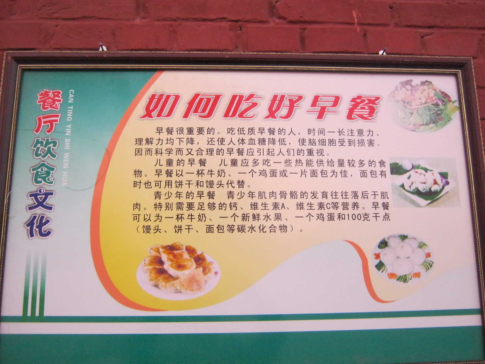 我们餐厅的侧墙上有了明显变化。如何吃好早餐这是大家普遍关心的问题。我们青少年肌肉骨骼的发育往往落后于肌肉,特别需要足够的钙、维生素A、维生素C等营养早餐。牛奶、鸡蛋等是我们的必须品,我们的营养早餐正好可以满足我的需要。