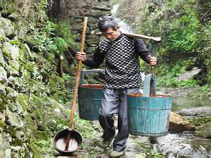 以前,因为在农村,工具不发达,家里也穷。爷爷们就担着两个桶去泉水那里接水,然后担回来倒入水缸,然后又去担水,一直要把家里那个大缸装满为止。再后来,到了我爸爸小时候时,就不用去担水了,可以用很长的水管抽水到水缸里,就没那么麻烦了。