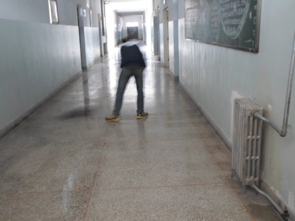 看,这位同学扫的可认真了,好像连一颗尘埃也不放过似的,那位同学拖楼道拖得可认真了。突然,他好像发现了一个“敌人”,于是乎赶紧叫了扫楼道的同学来消灭它。