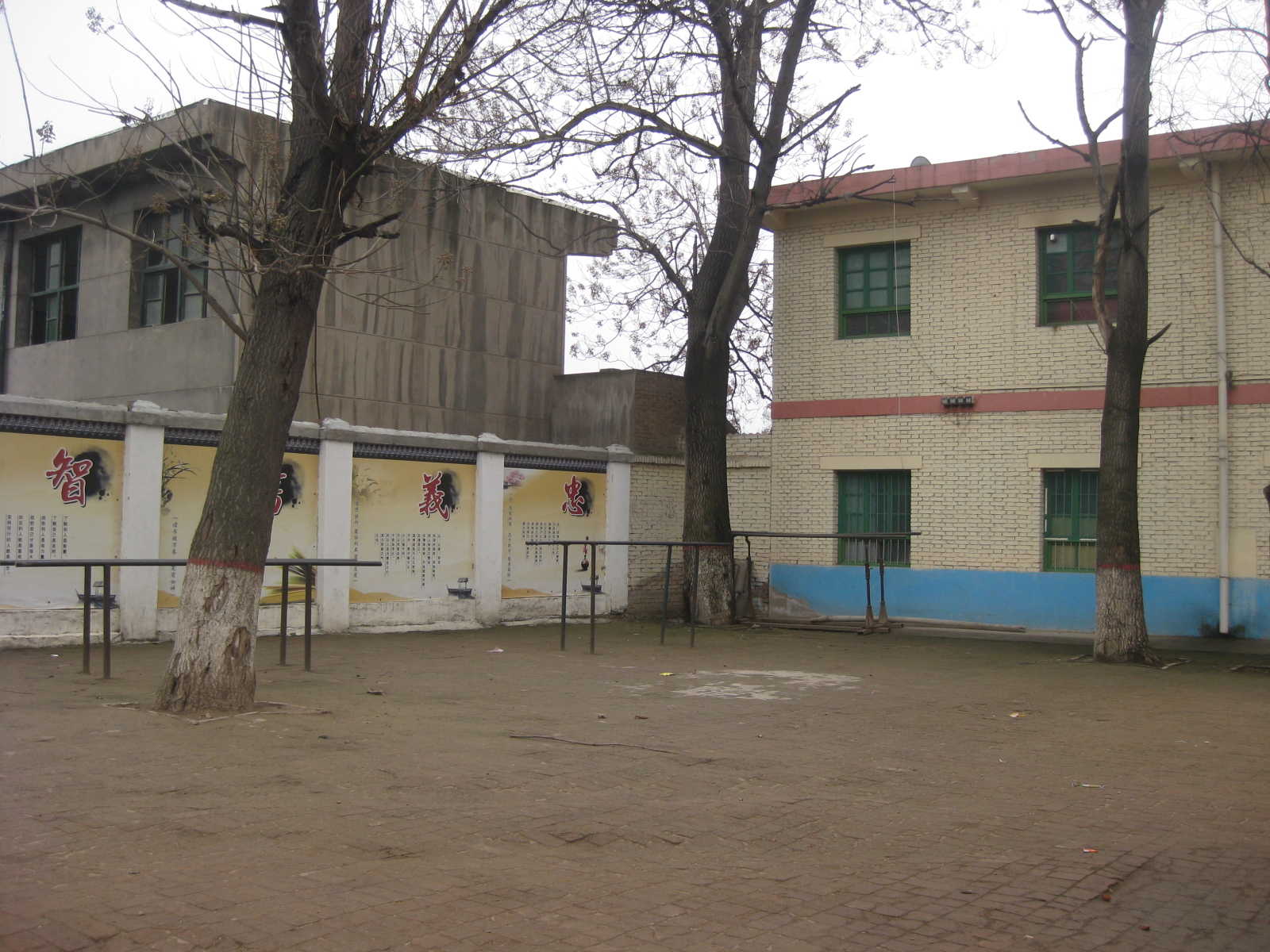 学校的大门朝南,进了大门,右边一直往北走连续有三栋大楼,分别有物理实验室,生物实验室,有媒体教室,其余的是老师的住房,每栋楼分别有两层,和气来就有很多房间了,在这三栋楼中最偏北的一栋楼,楼梯偏西的这面墙上上有公告栏,是值周老师用来记录各班情况的。