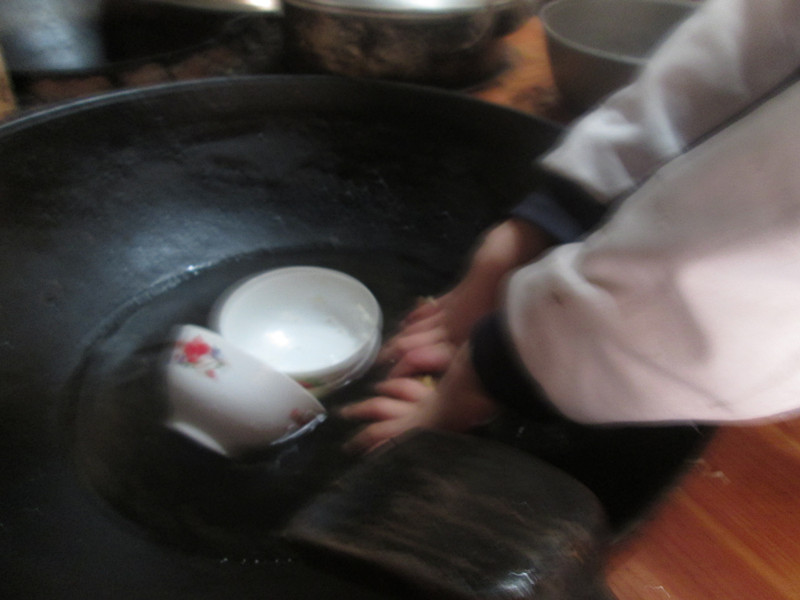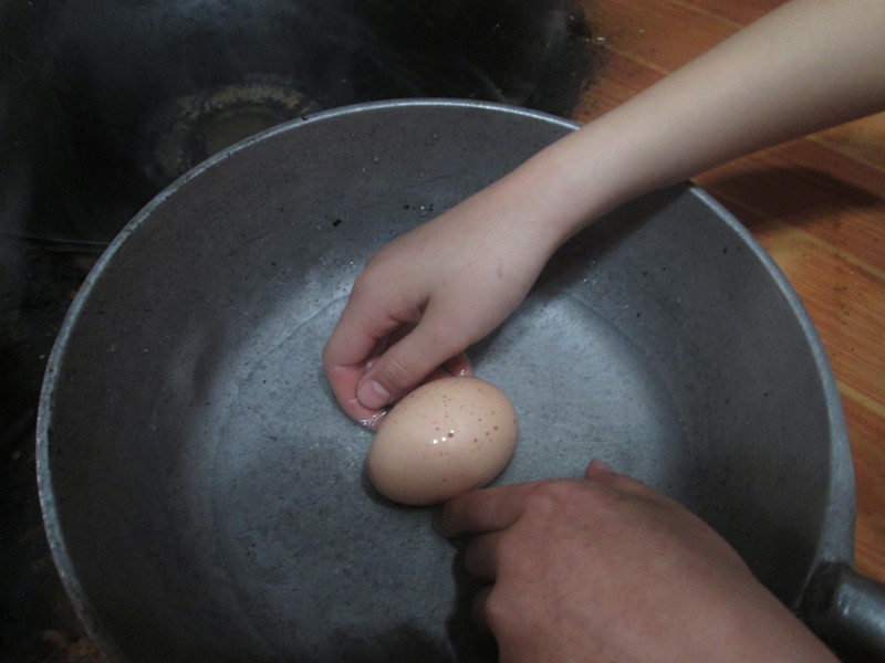 妹妹先用柴把锅点燃,她说她一直烧锅,其他的就由我来做。我先用锅铲在油缸里铲了一些油放在锅里,油化了,我又放了一点盐在锅里。然后我把蛋敲碎,打进锅里,再用锅铲来回翻炒。蛋炒好后,我又把饭放进锅里,再来回翻炒 。等饭炒热、蛋炒熟,再放些葱和调料便可以出锅了。