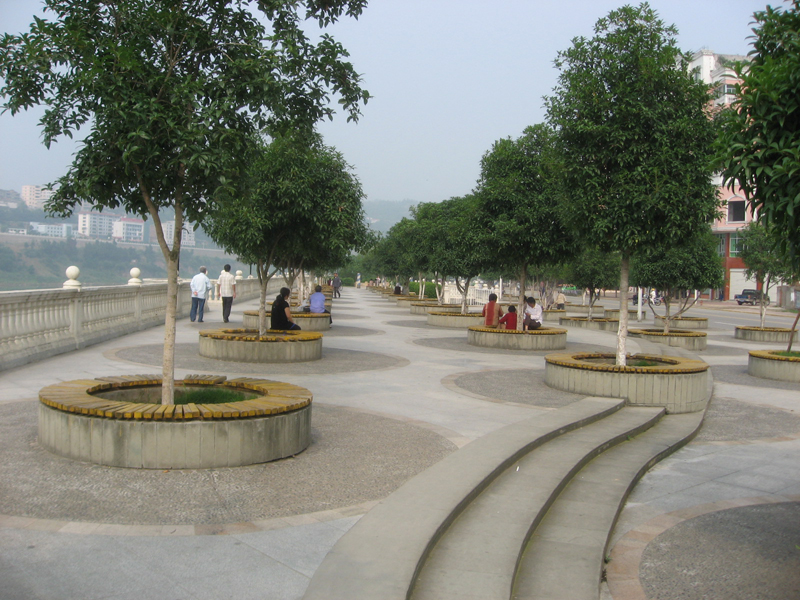 我们县城的滨江路是家乡人民休闲娱乐的场所之一。图中是滨江路上的一个休息场地,在这里人们不分男女老少都坐在一起玩耍。早晨有很多老人结伴出来锻炼身体。