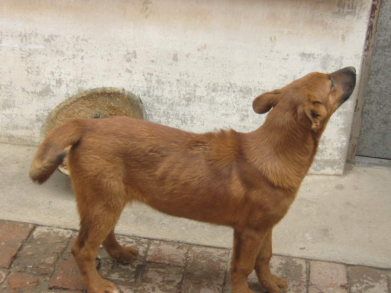 我走进了一条小巷,“哇,好大的狼狗啊。”我赞扬道。那只大狗好像几天没吃东西似的,目不转睛地盯着我。终于狗按奈不住了,开始追我,好像喊道:大香肠,别跑!”