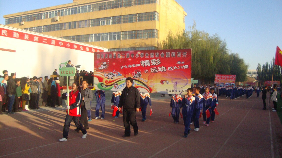 又一 个身穿红蓝白校服的方队走上前来,他们高举“让生命更加精彩,让运动成为习惯!”这是泉山镇完全小学的方队。同学们带着乡村学校的孩子们特有的质朴和执着,兴致勃勃的看着这一次盛大的集会。
