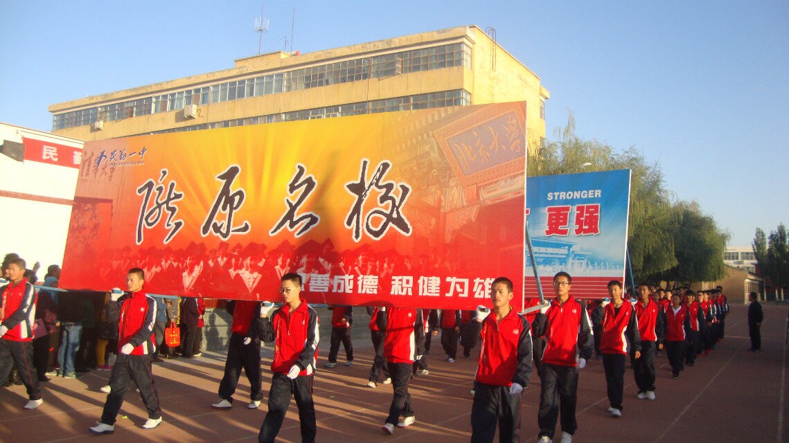一年一度的全县运动会开幕了,看看各代表队英姿飒爽的脚步吧:看,眼前是民勤一中代表队,他们身穿红黑色校服,脸上洋溢着自信与昂扬斗志,高举"陇原名校"“更快,更高,更强!”的标语。多少年来,有多少莘莘学子从这里杨帆起航,实现了自己的梦想!