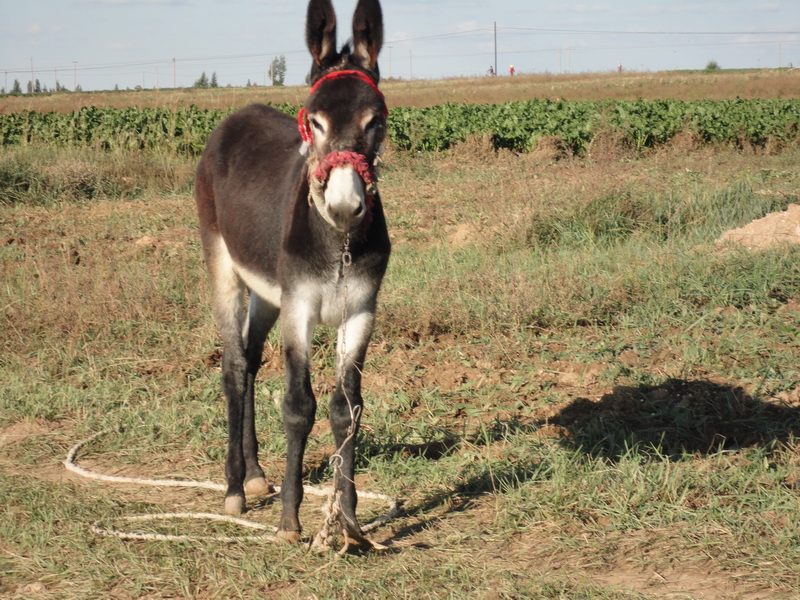 在微微泛青的草地上,一头毛驴头系着红色的缰绳,灰色的毛和红色的缰绳搭配的很是完美。这头毛驴好像发生了什么事情,目视前方,两只大耳竖得直挺挺的。是不是前方有敌情,还是什么?看起来它还很警觉,保护自己的的意识到挺强。辽阔的草地似乎归它所有,它可以随处走动。