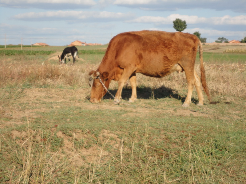 在微微泛青的草地上,一头黄牛在低头吃草。别看小草似有似无,但牛还是很专注,有时站立不动,仿佛思考着问题。牛犊可不一样了,非常调皮,四处乱窜,饿了找牛妈妈,趴在牛妈妈的乳头上吮吸着白色的牛奶。吃饱又开始在草地狂奔,无忧无虑地过着每一天。