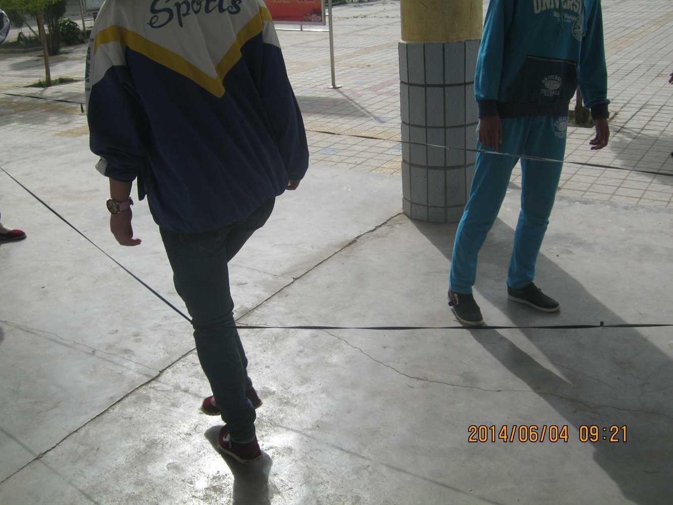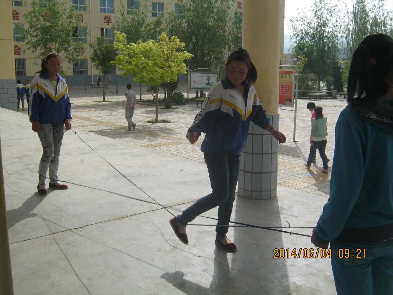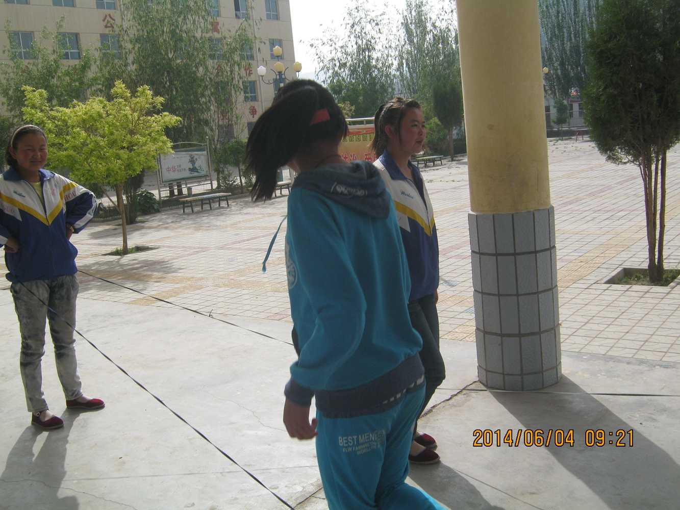 中午,写完作业后,看初一、初二的女同学们在跳皮筋,玩得很开心,我们也加入了。