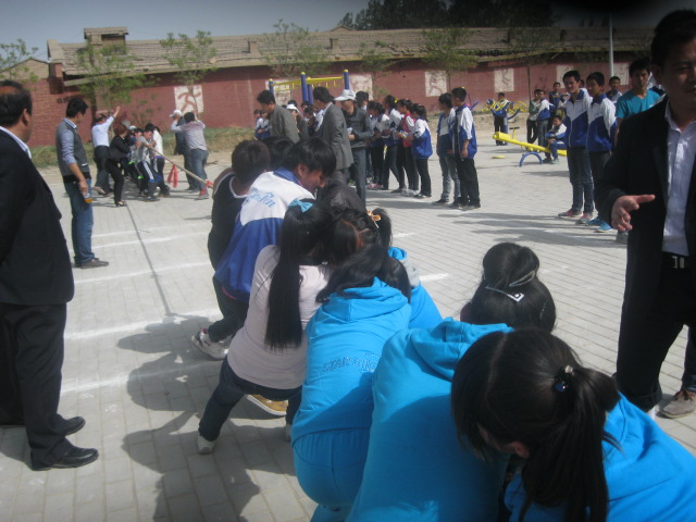麻绳中间的红绸子忽左忽右,我们的心也像红绸子一样晃悠着。双方都咬紧牙关坚持着,忽然间对方好像吃了大力,我们的脚下一滑被拉了过去,糟糕!快要过线了!观看的同学们有的继续扯着哑了的嗓子喊加油,叫喊声此起彼伏;还有的同学急得直跺脚,恨不得上去帮一把,在这时,赵老师伴随着有节奏的哨声,挥动着手臂,毫不放弃在为我们助威,瞬间好像奏响了奋发的号角,加油声响彻了操场上空,我们的队伍又振作起来,似乎拥有无穷的力量,就在这千钧一发之际忽然迸发出来,很快扭转了局面,对方似乎不敢置信,恍惚间兵败如山倒。